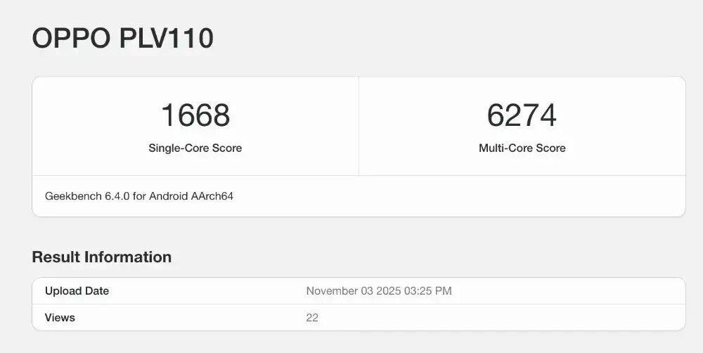 认证信息显示,这款新机单核跑分为 1668 分,多核跑分为 6274 分。核心搭载联发科天玑 8450 芯片,提供16GB 内存,运行基于 Android 16 的 ColorOS16 系统。
