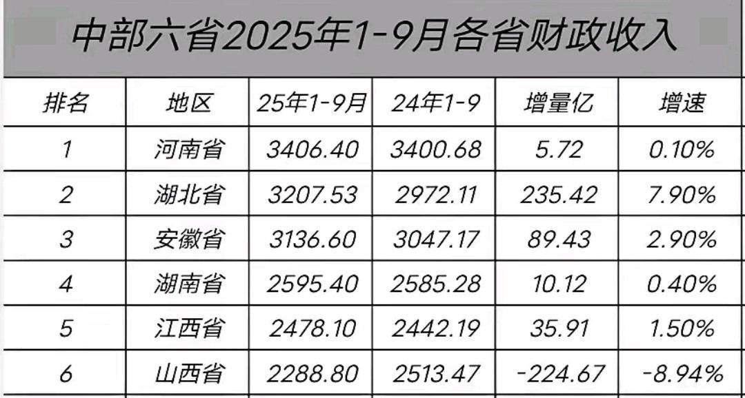 中部六省2025年1-9月财政收入呈现新格局,河南继续稳坐榜首,湖北凭借强劲增长跃升第二,安徽调整至第三但仍保持稳健增势,湖南持续稳定位列第四,江西实现了对山西的超越升至第五,各区域经济发展韧性凸显。整体看,财政收入洗牌反映了中部地区产业优化和结构升级的积极态势,湖北增速7.9%领跑,江西增1.5%展现新兴活力,湖南稳增0.4%,山西虽面临转型仍积极推进发展。